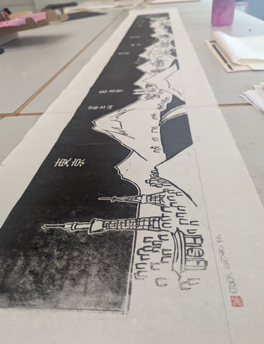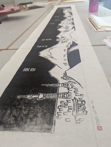 La xilogragía muestra mi ruta durante el viaje a través de varias ciudades, inspirada en una xilografía que encontré en Arashiyama que mostraba un "paisaje continuo" entre Osaka y Kioto.